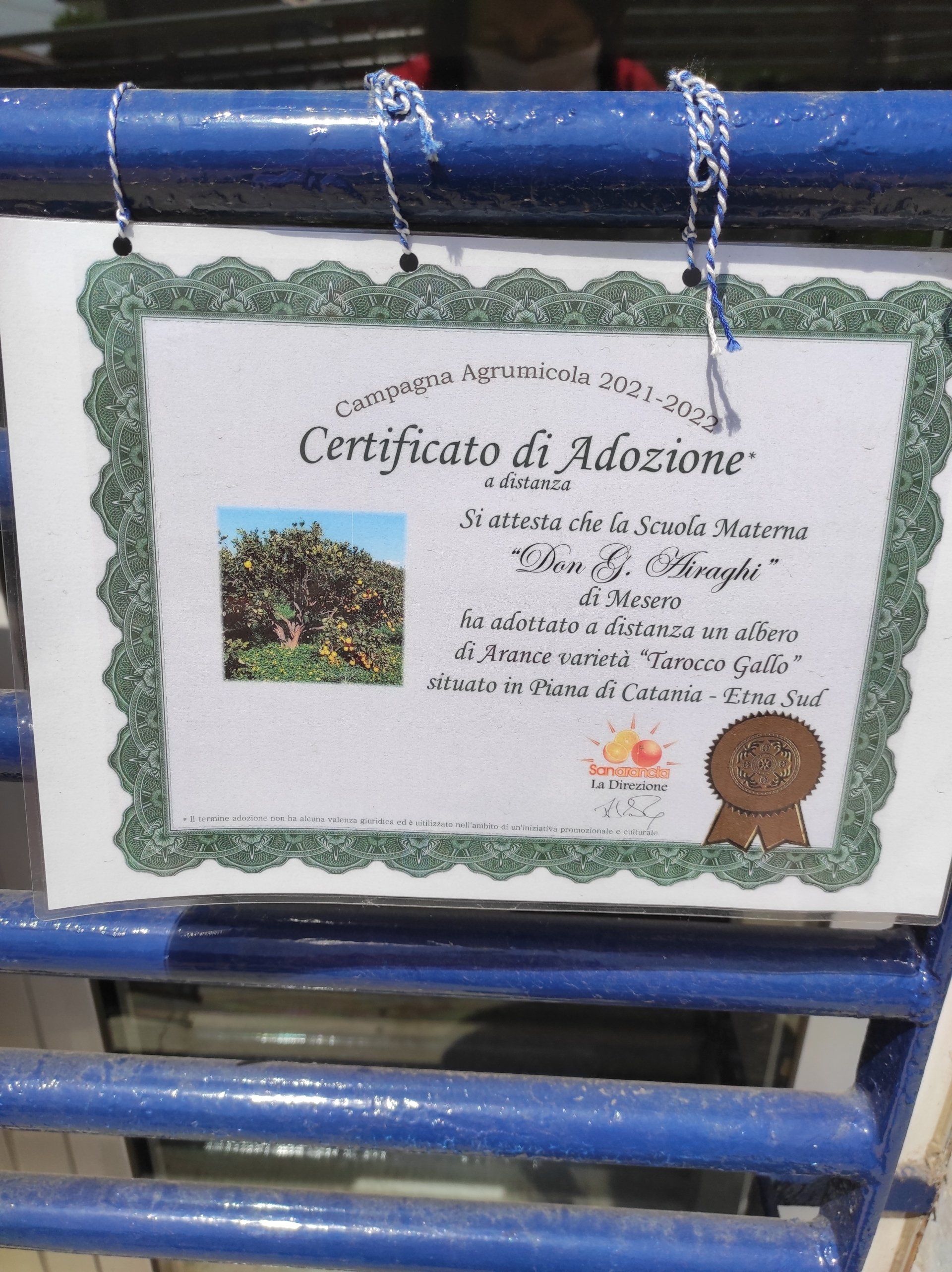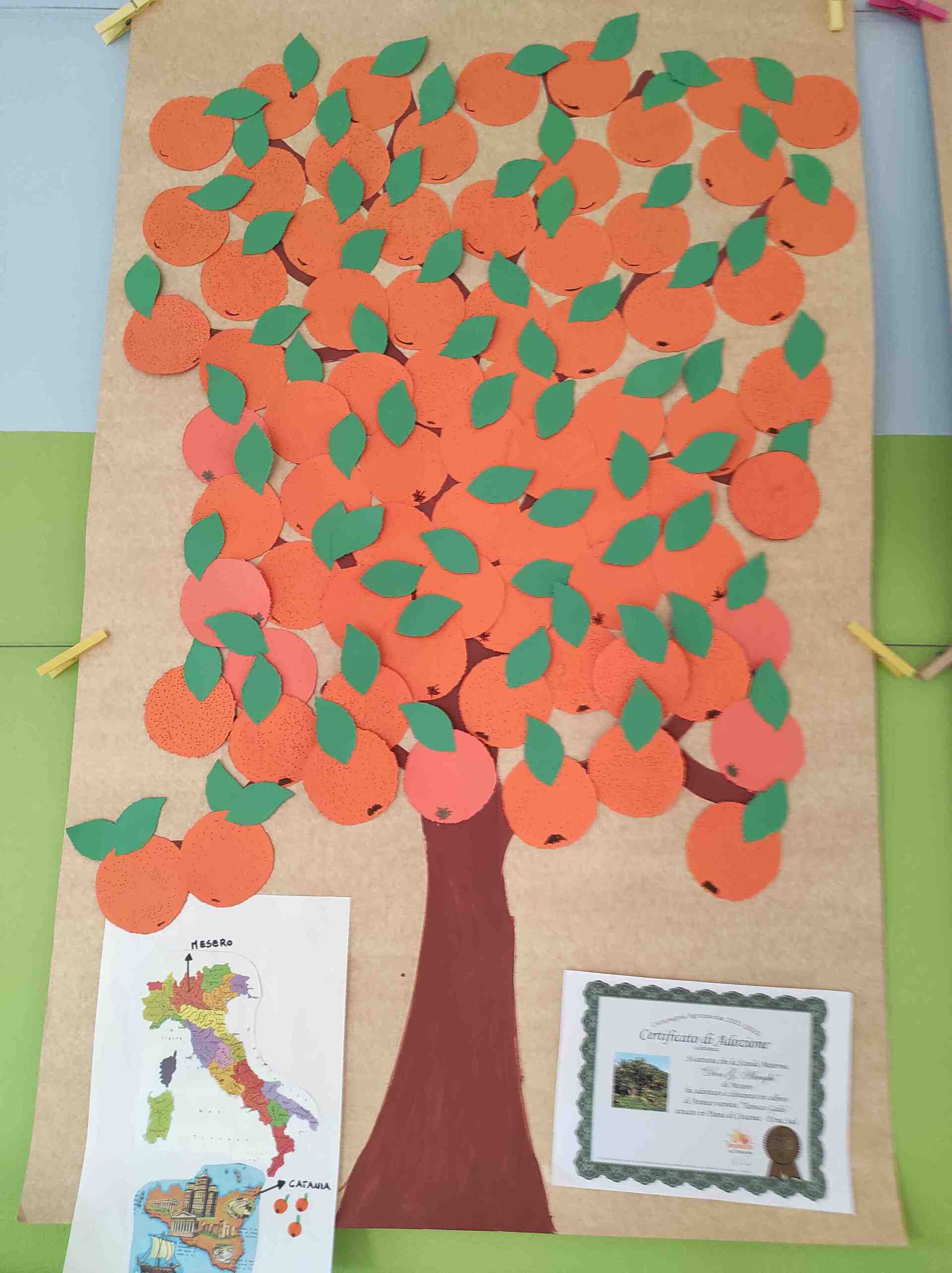 La scuola ha accettato la proposta inoltrata da un’azienda agricola di Catania di adottare un albero di arance; i bambini in attesa di ricevere le arance hanno realizzato il loro albero. A conclusione dell’iniziativa ogni bambino ha potuto gustare a casa, con la propria famiglia, un’ottima spremuta. Abbiamo inoltre ricevuto il certificato d’adozione!