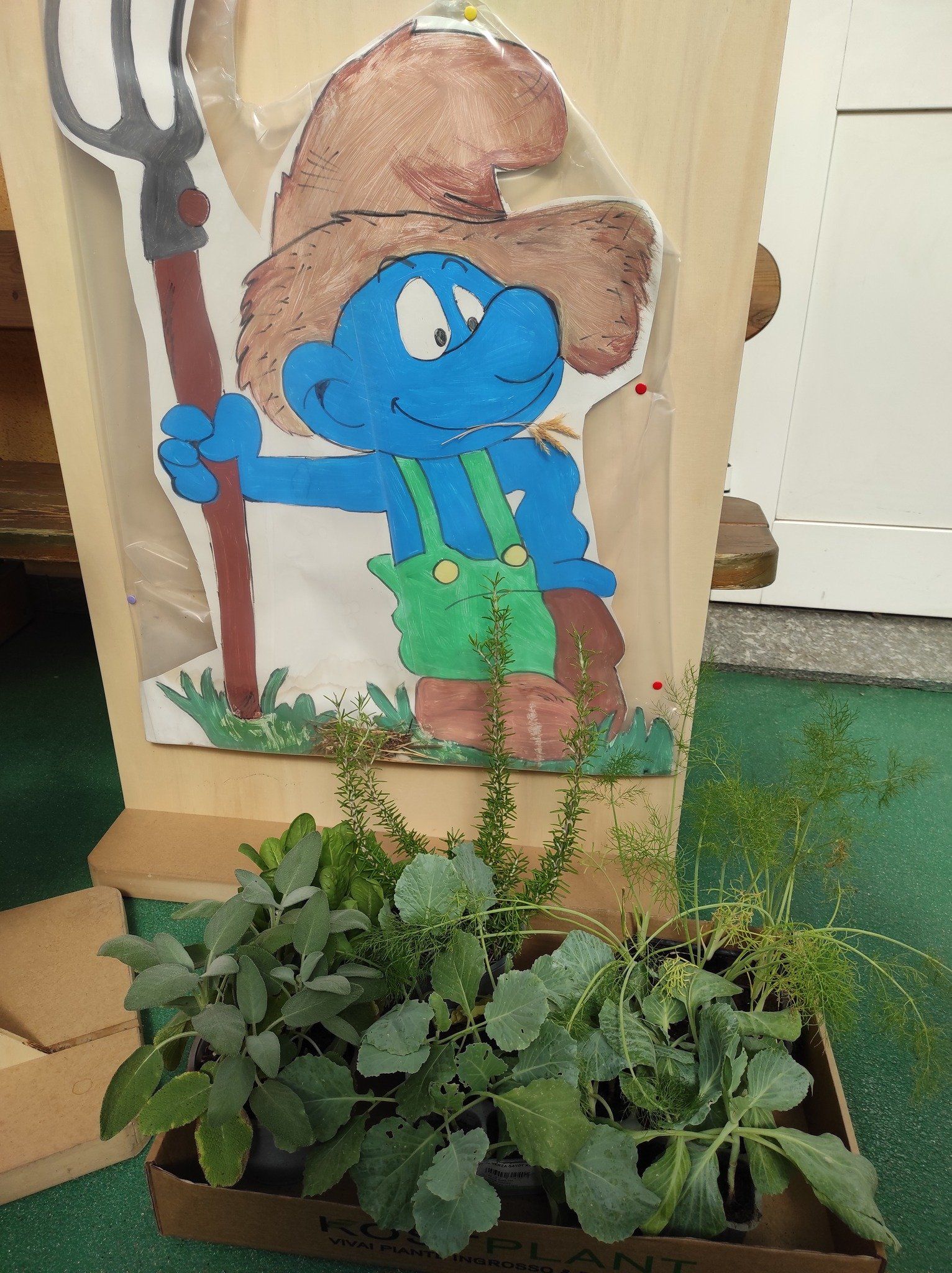 Puffo Contadino è ritornato, ci ha portato finocchi, cavoli, salvia, rosmarino e insalata per il nostro orto ! Eccoci all'orto.