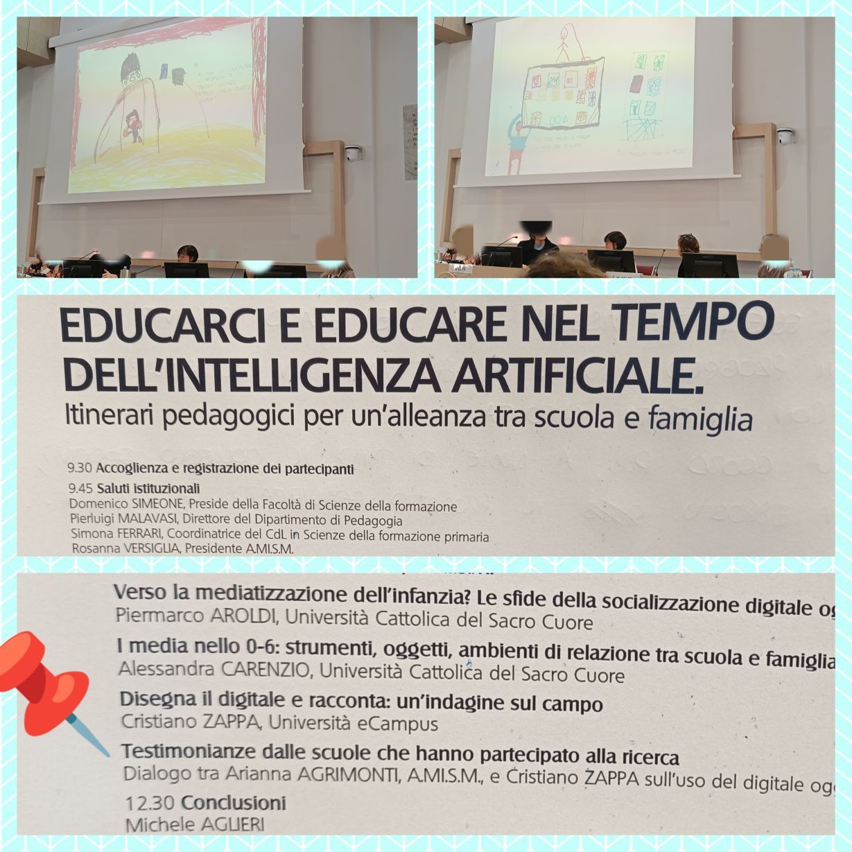 Abbiamo il piacere di condividere con voi che la nostra scuola dell'infanzia è stata scelta, tra diverse scuole del territorio lombardo, per raccontare al convegno FISM dell' 11 ottobre, "Educarsi ed educare nel tempo dell'intelligenza artificiale " , l'esperienza vissuta lo scorso anno con i bambini grandi, durante il progetto "Disegna il digitale e racconta", in collaborazione con l'Università Cattolica di Milano. Il progetto guidato dal professor Cristiano Zappa ha l' obiettivo di analizzare le ricadute dell'uso delle tecnologie digitali nei processi di apprendimento e insegnamento in contesto ludico.